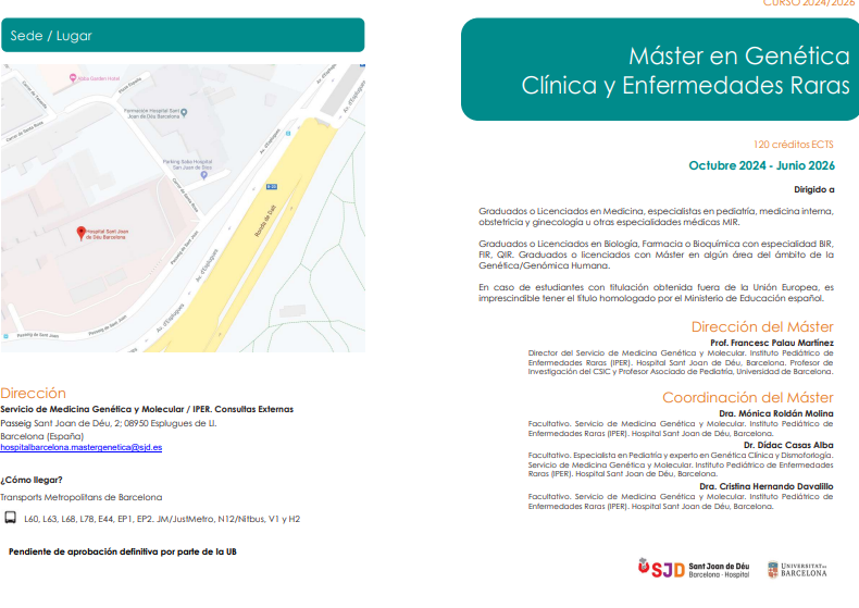 Para más detalles, pueden visitar la web: https://formacion.sjdhospitalbarcelona.org/master-genetica-clinica-enfermedades-minoritarias. El día 5 de julio a las 14:00 se realizará una sesión informativa.